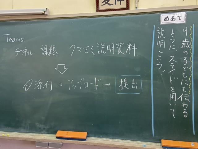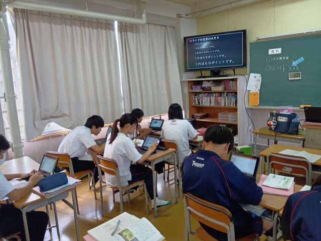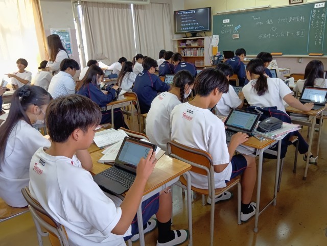 クマゼミ説明資料をタブレットパソコンを使って、一生懸命に生徒は作っていました。あまりの真剣さと静かさにとても感心しました。