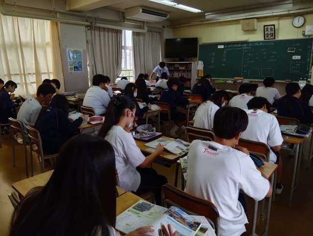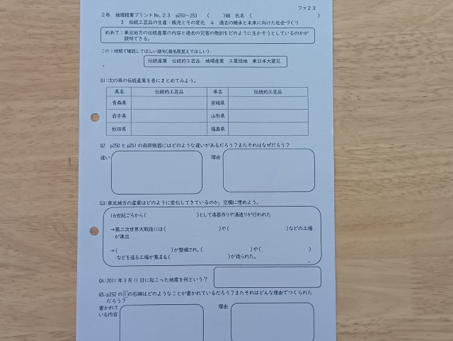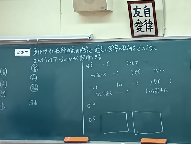 授業のめあては「東北地方の伝統産業の内容と過去の災害の教訓をどのように生かそうとしているのかが説明できる」でした。本当に静かな教室でした。黙々と学習プリントの調べものをしている47期生に感心しました。