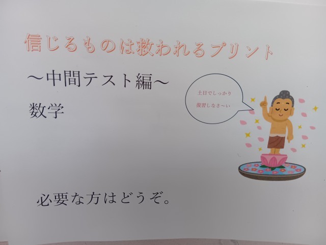 中間テスト3日前になりました。1年生の学年主任の先生が勉強用の学習プリントを作ってくれていました。