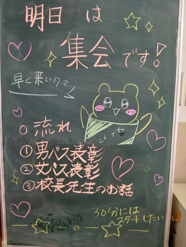 8時25分には、体育館に集合しましょう。黒板は生徒会役員が書いてくれました。
