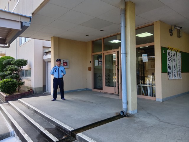 警備員さんが不審者対応として、今日も職員玄関に生徒の登校時間に合わせて、立ってくださっていました。