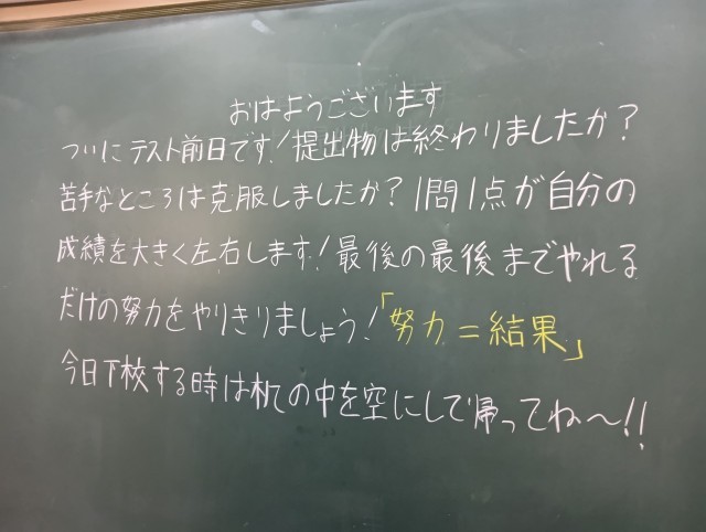明日から行われる中間テストに向けて、メッセージが書かれていました。「努力=結果」です。1年1組の生徒のがんばりを期待しています。