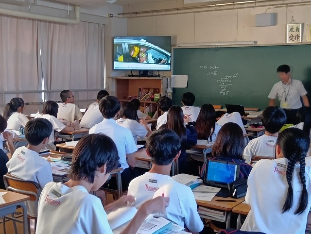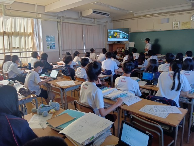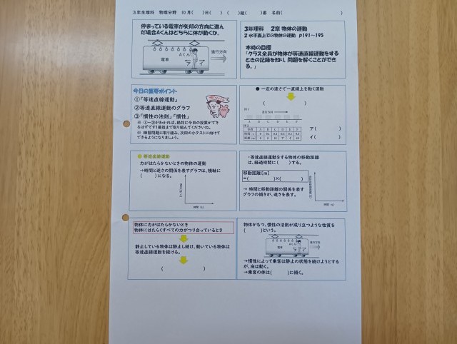 学習内容は「物体の運動」、授業のめあては「クラス全員が物体が等速直線運動をする時の記録を知り、問題を解くことができる」でした。慣性の法則を表した動画を全員で真剣に見ている姿に感心しました。