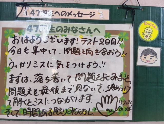 47期生にテストで気をつけてほしいことや最後までがんばり抜いてほしいことなどが書かれていました。
