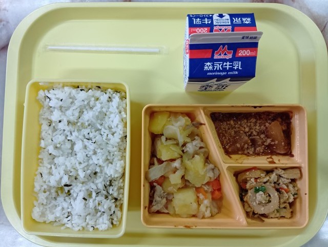 今日のメニューは、菜めし、塩ぶたじゃが、大根の肉みそ煮、卯の花、牛乳です。