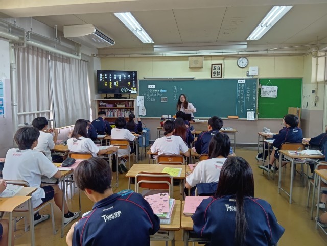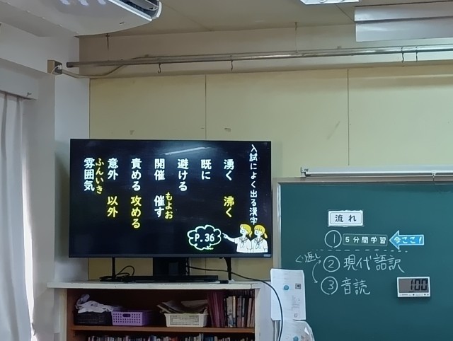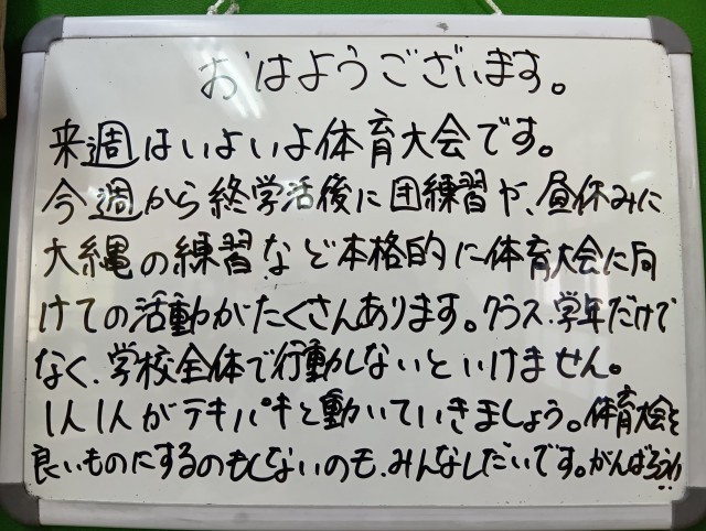 学習内容は「平家物語」でした。少しでも分かりやすい授業を行うために、かわいい教材や教具がたくさん作製されていました。教室内にあるホワイトボードには、今日も担任の先生からのメッセージが書かれていました。