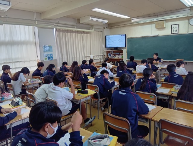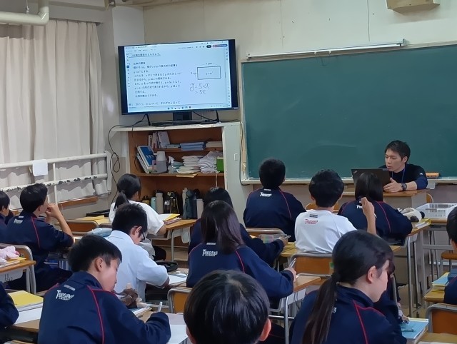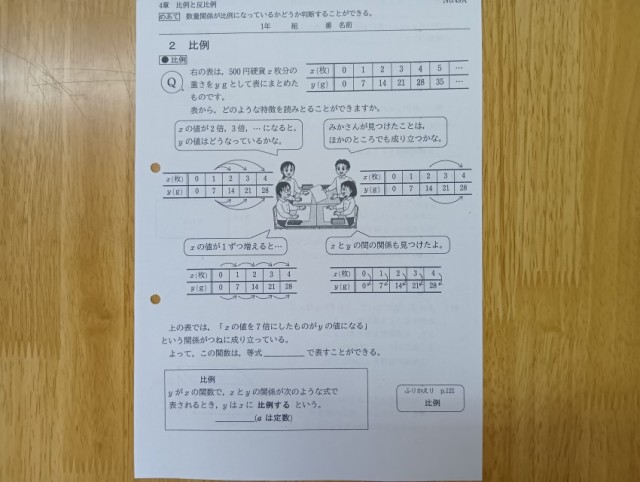 学習内容は「比例と反比例」てした。配付された学習プリントや大型テレビに映し出されたデジタル教科書を使って、授業が進められていました。