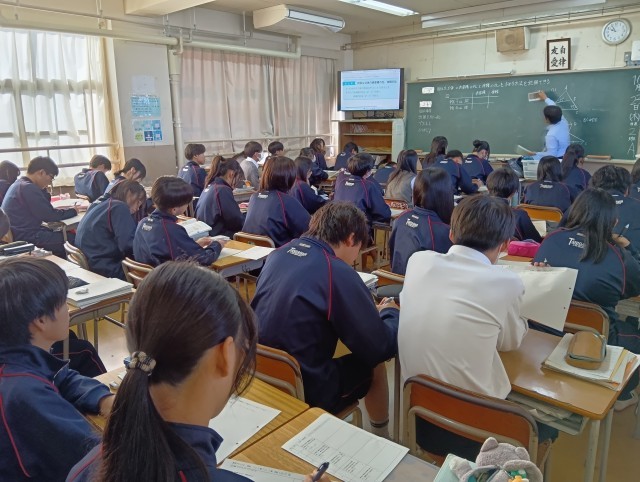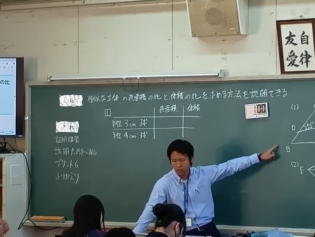 授業のめあては「相似な立体の表面積の比と体積の比を求める方法を説明できる」でした。学習プリントを一生懸命に解く生徒の姿に感心しました。