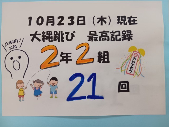 今日、一番跳べたクラスは2年2組の21回でした。練習はうそをつきません。努力は必ず報われます。みんなで明日も練習を続けましょう。
