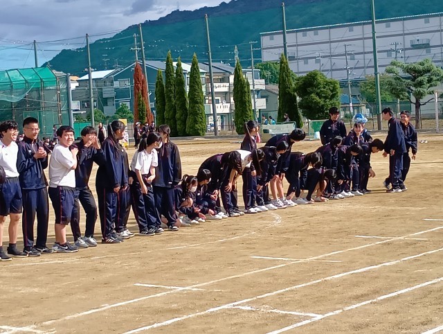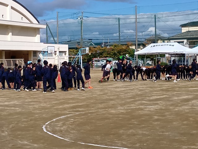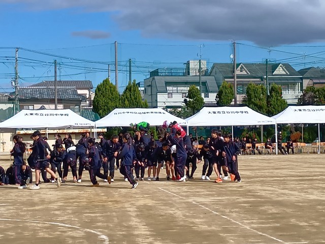 団対抗 背中渡りリレーの様子です。優勝は緑団でした。みんなよくがんばりました!