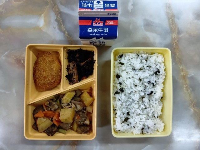 今日のメニューは、わかめごはん、炒め鶏煮、国産キャベツメンチカツ、ひじきの煮物、牛乳です。