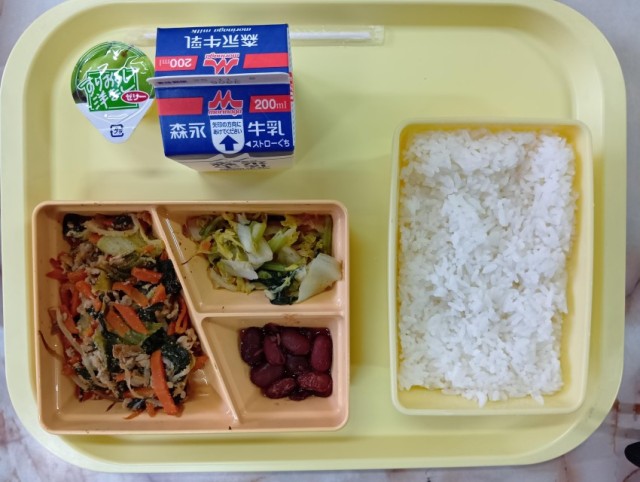 今日のメニューは、白ごはん、豚肉のビビンバ風、白菜のおかか、金時豆の煮物、プチすりおろし洋なしゼリー、牛乳です。