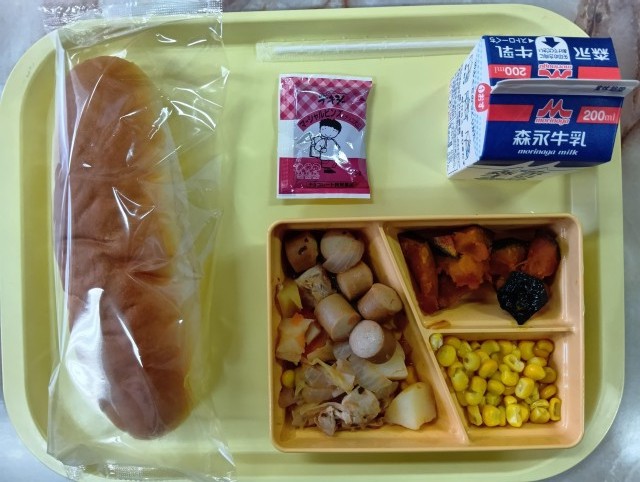 今日のメニューは、コッペパン、リヨン風チキンポトフ、ハニーパンプキン、ボイルコーン、チョコレートクリーム、牛乳です。