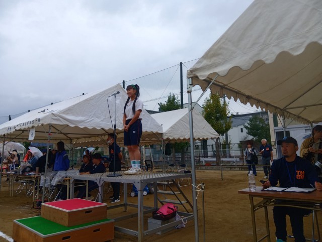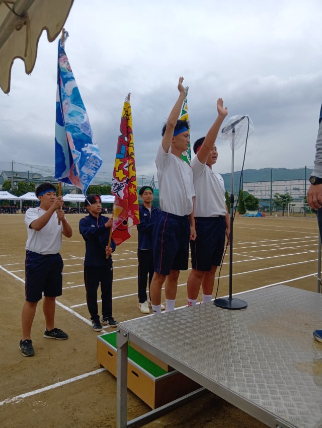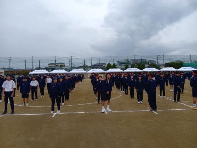 小雨が降る中でしたが、体育大会を予定通りに開始しました。写真は開会式の様子です。選手宣誓や準備体操も3年生が見本となり、立派に行うことができました。担当した3年生がとてもかっこよかったです。