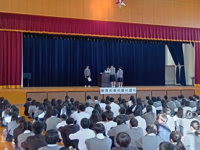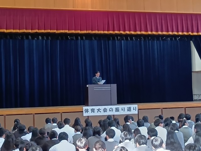 体育大会で行われた大縄跳びとチェッコリダンス賞の表彰を行いました。校長からは「体育大会を振り返って」というタイトルで生徒に手紙が読まれました。