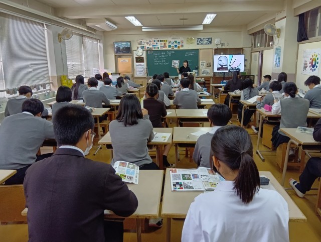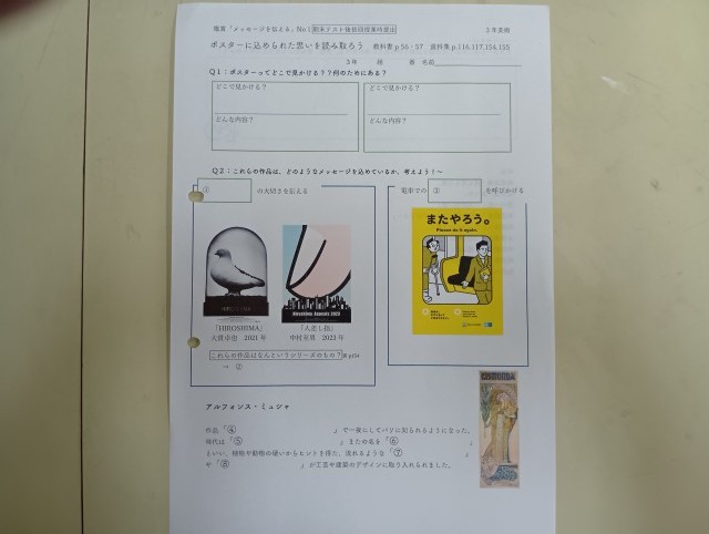 授業のめあては「ポスターに込められた思いを知ろう」でした。大型テレビに様々な作品が映し出されていました。