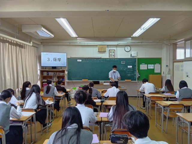 学習内容は「開かれた窓口〜江戸時代の国際関係〜」でした。配付された学習プリントと大型テレビを使いながら、授業が進められていました。