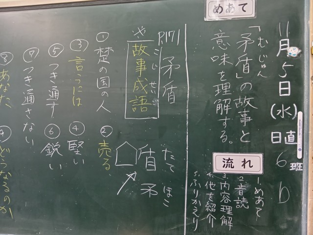 学習教材は「今に生きる言葉」、授業のめあては「矛盾の故事と意味を理解する」でした。午後の授業でも、集中力を切らさずに子どもたちはがんばることができていました。
