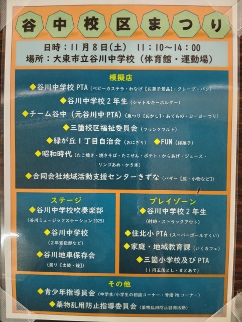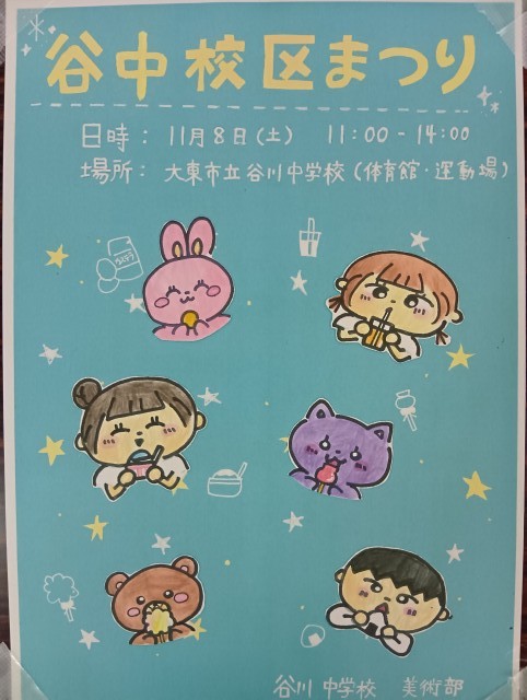 いよいよ2日後に迫った谷中校区まつり。これまで地域教育協議会を中心に、たくさんの話し合いと準備が行われました。お天気にも恵まれそうです。当日は、模擬店に加え、体育館でのステージ発表やグラウンドでのプレイゾーン体験があります。たくさんの保護者の方や地域の方、卒業生の来校をお待ちしています。