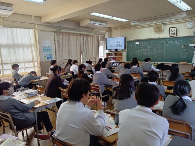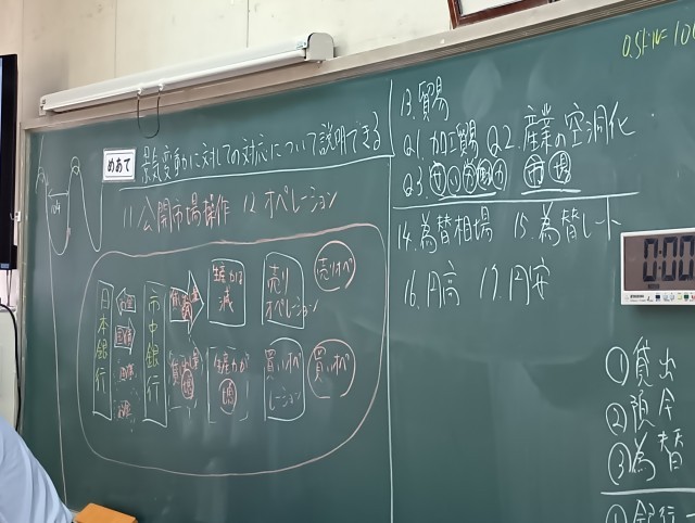授業のめあては「景気変動に対しての対応について説明できる」でした。現在の1ドルを日本円に直して、買い物の計算が行われていました。