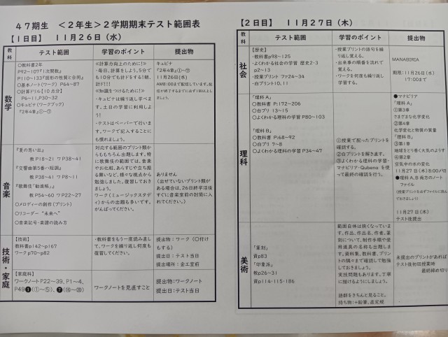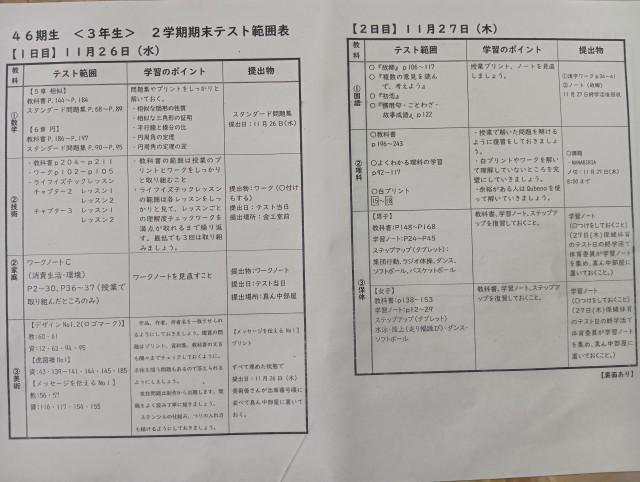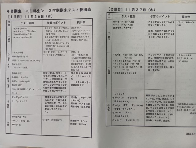 期末テスト範囲表が配られました