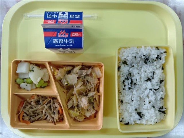 今日の給食は、わかめごはん、とりすき焼風にこみ、ごぼうサラダ、じゃが枝豆、牛乳です。