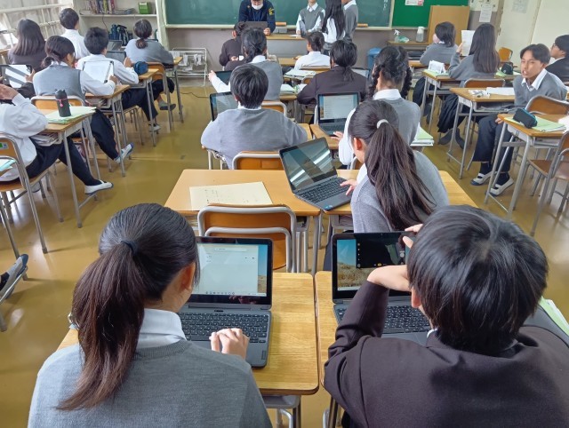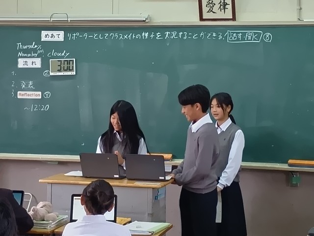 2組も新しく導入されたタブレットパソコンが大活躍していました。授業のめあては「リポーターとして、クラスメイトの様子を実況することができる」でした。発表者も堂々と発表することができていました。