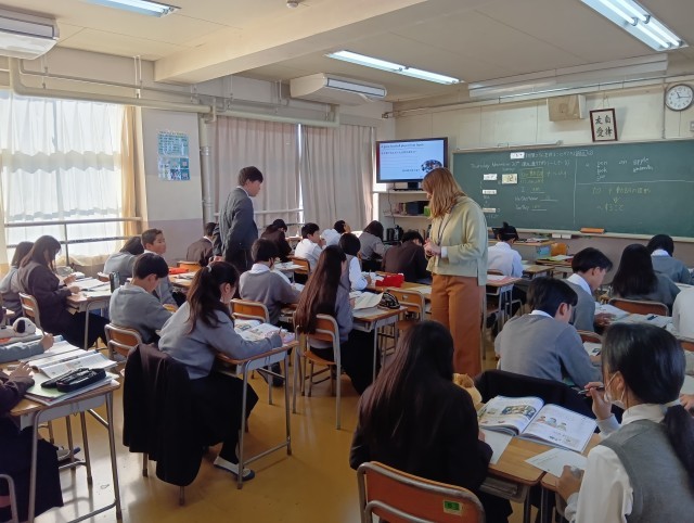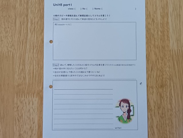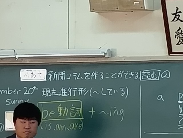 授業のめあては「新聞コラムを作ることができる」でした。今日も教科担当の先生と英語実習助手(AET)との連携は、本当に見事でした。