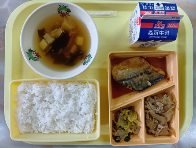 今日のメニューは、白ごはん、鯖のみそ煮、豚肉のしょうが炒め、白菜のおかか、すまし汁、牛乳です。