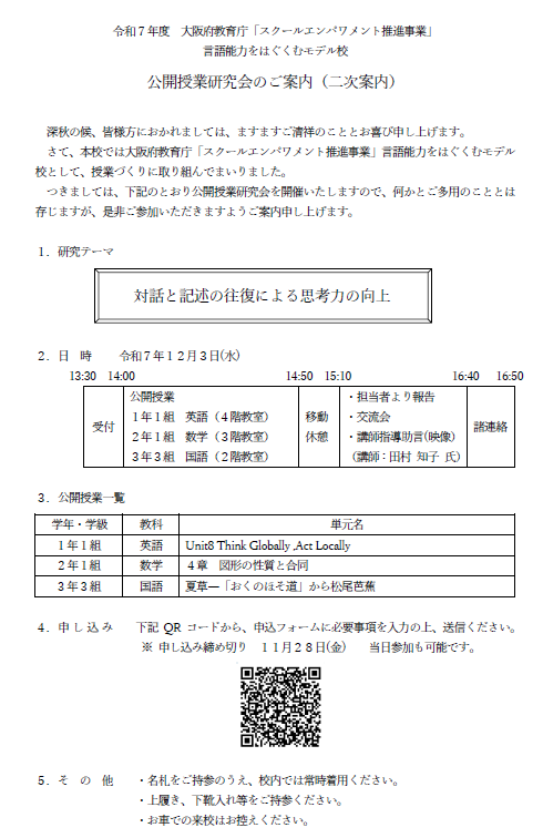 令和7年度 大阪府教育庁「スクールエンパワメント推進事業」言語能力をはぐくむモデル校としての公開授業研究会【12月3日(水)実施】が来週に迫ってきました。参加申し込みは、ホームページ上のQRコードから、申し込みフォームに必要事項を入力の上、送信ください。申し込み締め切りは11月28日(金)です。当日参加も可能です。