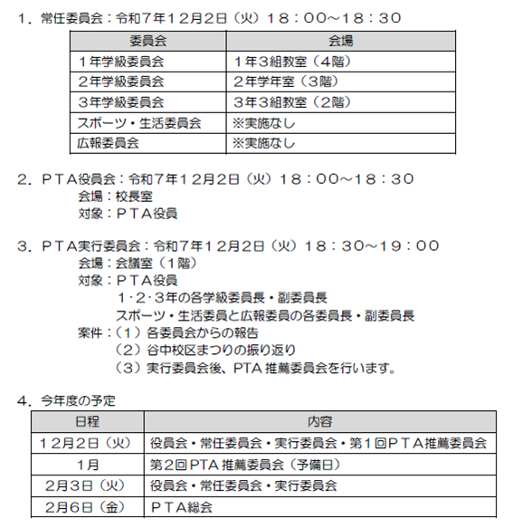 12月PTA常任委員会・実行委員会の案内をお知らせいたします。よろしくお願いいたします。
