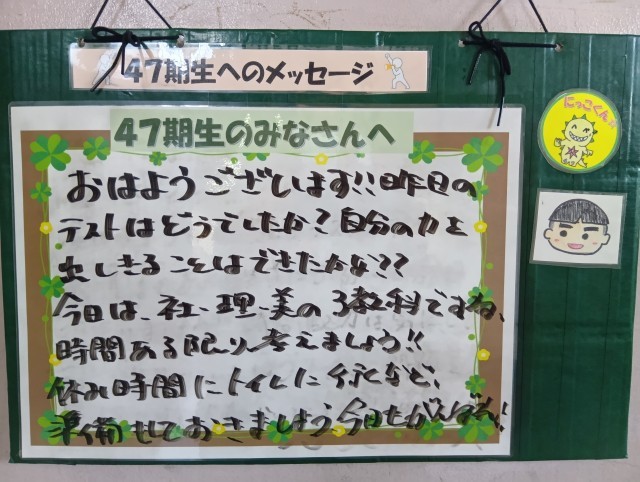 今日のテストに向けて、励ましのメッセージが書かれていました。