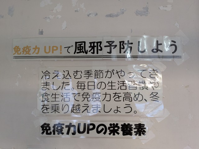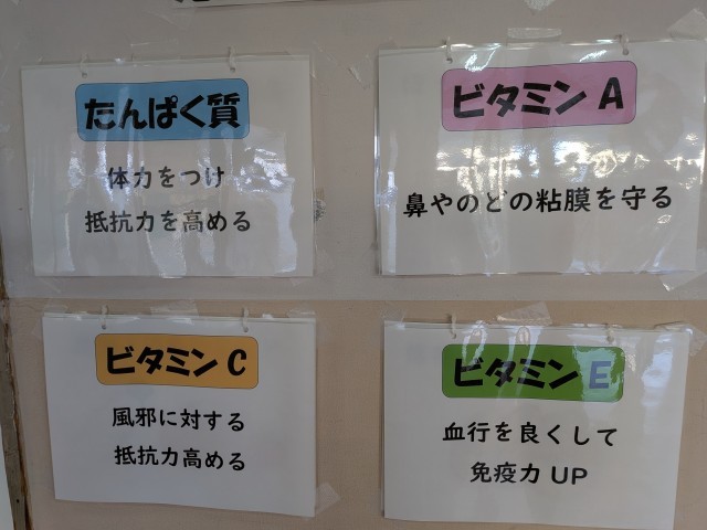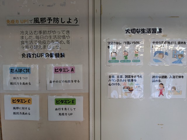 大東市の栄養士さんが定期的に本校を巡回指導に来られています。配膳室前廊下の掲示物も、来られている栄養士さんが定期的に掲示してくださっています。