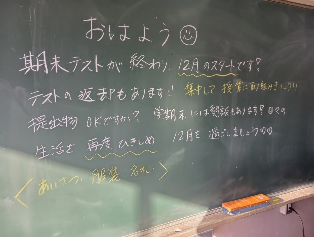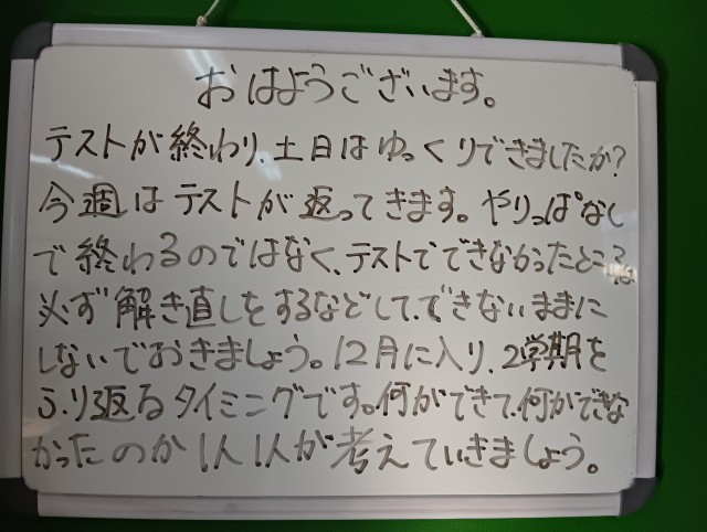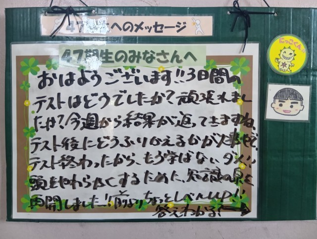 写真は上から、2年学年主任、2年2組担任、2年3組担任からの今日のメッセージです。期末テストが各教科から返却されます。どのメッセージもテスト返却について、書かれていました。