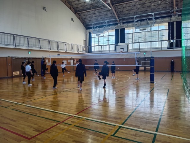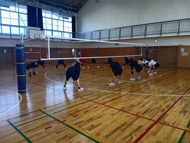 今日も女子バレー部が朝練をがんばっていました。顧問の先生も一緒にがんばっています。