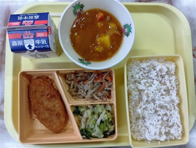 今日のメニューは、もち玄米ごはん、コーンコロッケ、ごぼうサラダ、チンゲン菜の炒め物、チキンカレー、牛乳です。