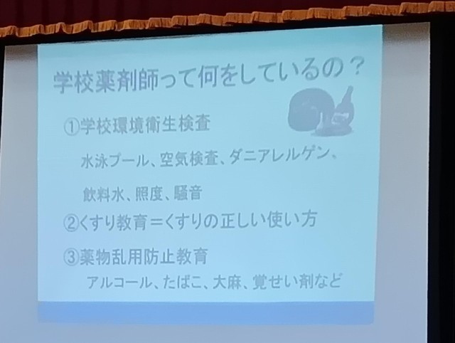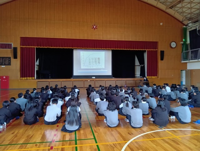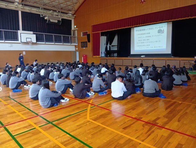 今日は本校担当の薬剤師さんをお招きして、薬物乱用防止教室を行いました。薬物(タバコ、大麻、アルコール)の危険性を動画やスライドを使って説明していただきました。薬物には依存性があり、はっきりと「断る勇気」が必要であると講師の先生は、おっしゃっていました。講演会後は、各自で振り返りとして、一人ひとりが静かに感想文を書くことができていました。