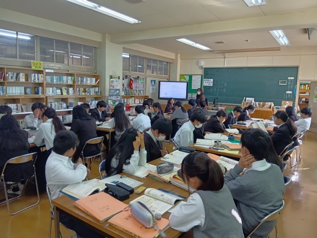 図書館を使っての「調べ学習」の時間でした。「3冊の本を使って調べること」が教科担当の先生からの指示でした。タブレットパソコンを使った調べ学習も大切ですが、辞書や本を使っての調べ学習も大切にしたいものです。