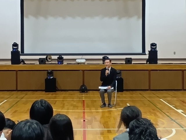 主催者代表の方が本校の卒業生(4期生)というご縁もありました。「チャンスは急にやってくる」、「自分らしく生きるために、自分のせいにして生きていく」、「本気で生きた人にしか壁は現れない」などの言葉は、谷川中学校の卒業生としての後輩たちへのメッセージだったと思います。今日の講演を聞いて、子どもたちは月曜日の総合的な時間に「自分の生き方宣言」を行います。