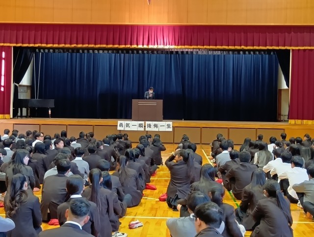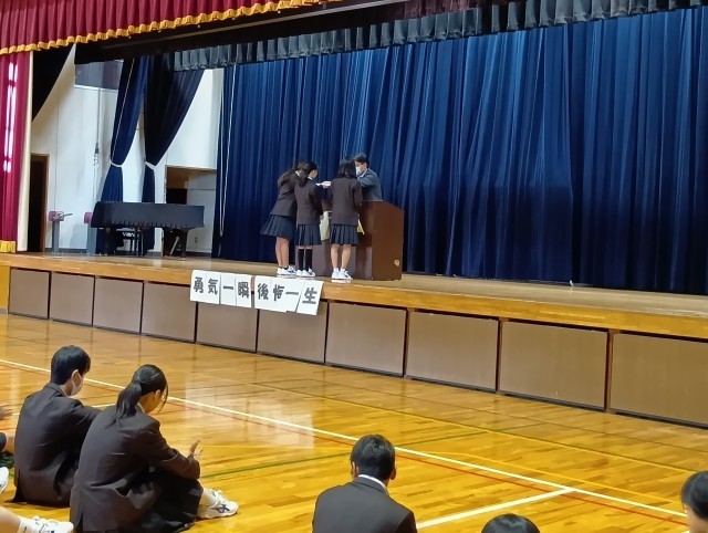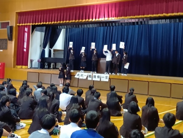 最初に「図書館を使った調べる学習コンクール」の表彰を行いました。本校からは、1年生の3名が「市長賞」、「市議会議長賞」、「教育長賞」を受賞しています。次に図書委員会から「朝の読書」について、発表がありました。朝の読書の取り組みを活発にしようと、工夫を凝らした発表でした。最後に校長からは「勇気一瞬、後悔一生」について、大学時代の話をもとに生徒に話をしました。今日も谷中生の「話を聞く態度」は、立派でした。