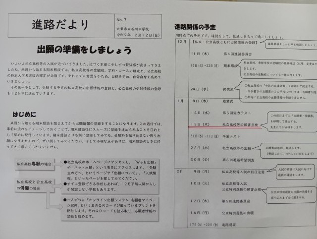 先週の12日(金)に3年生(46期生)に発行しました進路だよりに記載しています「進路関係の予定」の日程を私立高校の受験料振り込み期間の関係から一部変更します。