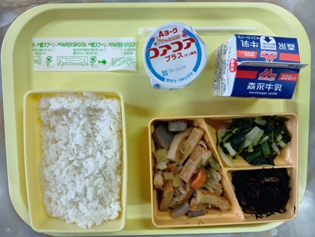 今日のメニューは、白ごはん、みそおでん、おひたし、ひじきの煮物、ヨーグルト、牛乳です。
