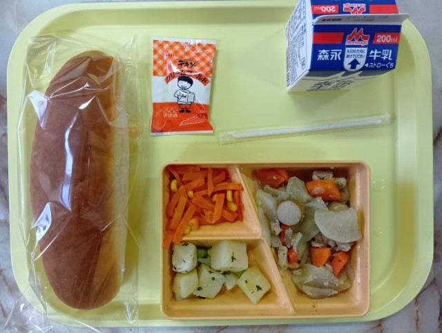 今日のメニューは、コッペパン、バジルチキンの洋風煮、じゃが枝豆、にんじんのレモンしょうゆ和え、ミルクバター、牛乳です。