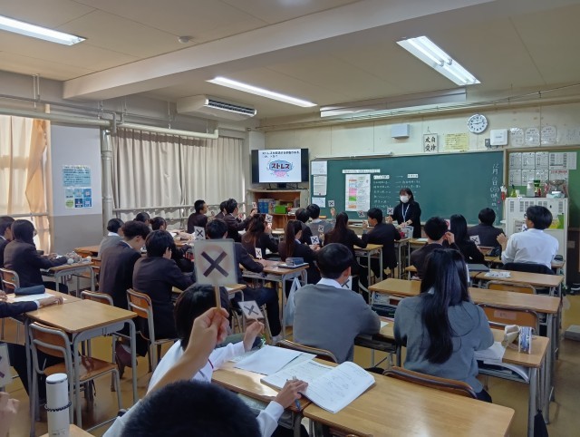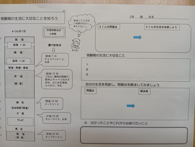 授業のめあては「受験期の生活に大切なことを知ろう」でした。今日は大東市の栄養教諭が3年生の全学級で「食育」の授業を行いました。いよいよ受験を目前に控え、冬休み前に規則正しい生活を心がけてほしいという願いを込めて、この時期の授業になりました。「早寝・早起き・朝ごはん」を心がけること、ストレスをためないこと、自分の時間を作ることなどが栄養教諭の先生からのアドバイスでした。3年生には、今日学んだことを是非、冬休みの受験勉強にいかしてほしいと思います。