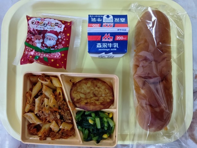 今日のメニューは、オレンジパン、ミートペンネ、ハッシュポテト、小松菜とコーンの炒め物、カップケーキ、牛乳です。
