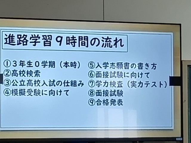 今日から2年生の進路学習が始まりました。全9時間の学習計画で、2月に行われる実力テストを来年受験する高校入試と仮定し、これから受験で必要となる心構えや準備すべきことを学んでいきます。3年生への準備期間(0学期)として、昨日からスタートした2年生にとてもよい緊張感の中で、授業が行われていました。やはり、努力=結果です。夢や目標を叶えた人ほど、しっかり計画を立て、準備をしています。
