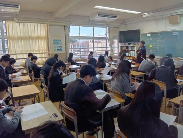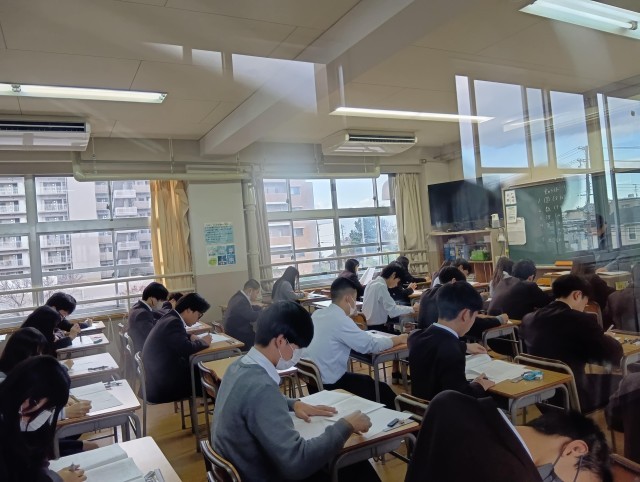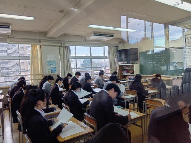 3年生(46期生)の最後の実力テストが始まりました。多くの生徒が受験する私立高校等の入試が目前に迫っています。緊張感漂う教室で国語のテストが始まりました。写真は上から、3年1組、3年2組、3年3組です。