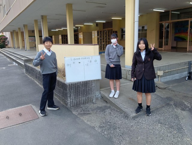 本当に寒い朝でしたが、生徒会役員が「どっち派アンケート」を下足室前で取っていました。タイトルは「あなたは春と秋のどっちが好きですか?」でした。アンケート結果は乞うご期待!