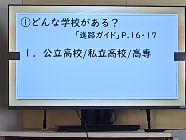先週の進路学習に引き続き、今日は「高校検索」として、進路ガイド冊子を活用しながら、様々な高校についてみんなで学習しました。今日の授業のめあては「自分が高校を選ぶとき、どの条件を重視(優先)するか考えよう」でした。先週の学習から、さらに引き締まった雰囲気の中で授業が行われていました。次回は公立高校入試について学習する予定です。写真は上から、2組、3組です。