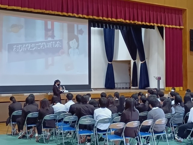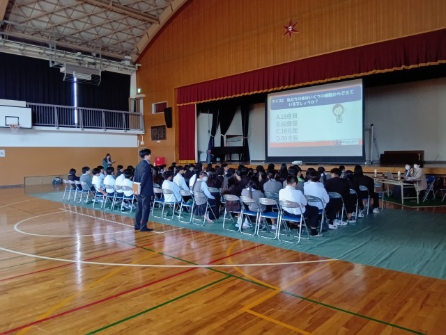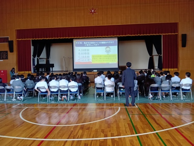 今日は本校に講師の方を招いて、2年生を対象にがん教育を行いました。がんになる確率や罹患しやすい年齢、がん細胞の働きなどをきめ細やかにご講義していだきました。子どもたちが今日学んだことを家庭でも話題にしていただければ幸いです。最後に47期生を代表してお礼の言葉を述べた生徒の態度は、本当に見事でした。